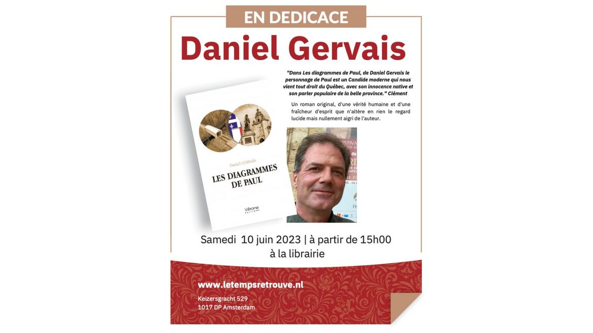 Venez rencontrer Daniel Gervais à la librairie, Le Temps Retrouvé, Amsterdam, le samedi 10 juin 2023, à partir de 15 heures pour faire dédicacer un exemplaire de son dernier livre, Les diagrammes de Paul (Vérone Éditions, 2023).