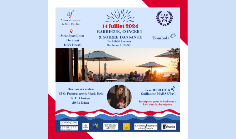 L’Alliance Française de La Haye se réjouit de vous convier à une soirée musicale et dansante accompagnée d’un barbecue, afin de célébrer la fête nationale française, le 14 juillet 2024.