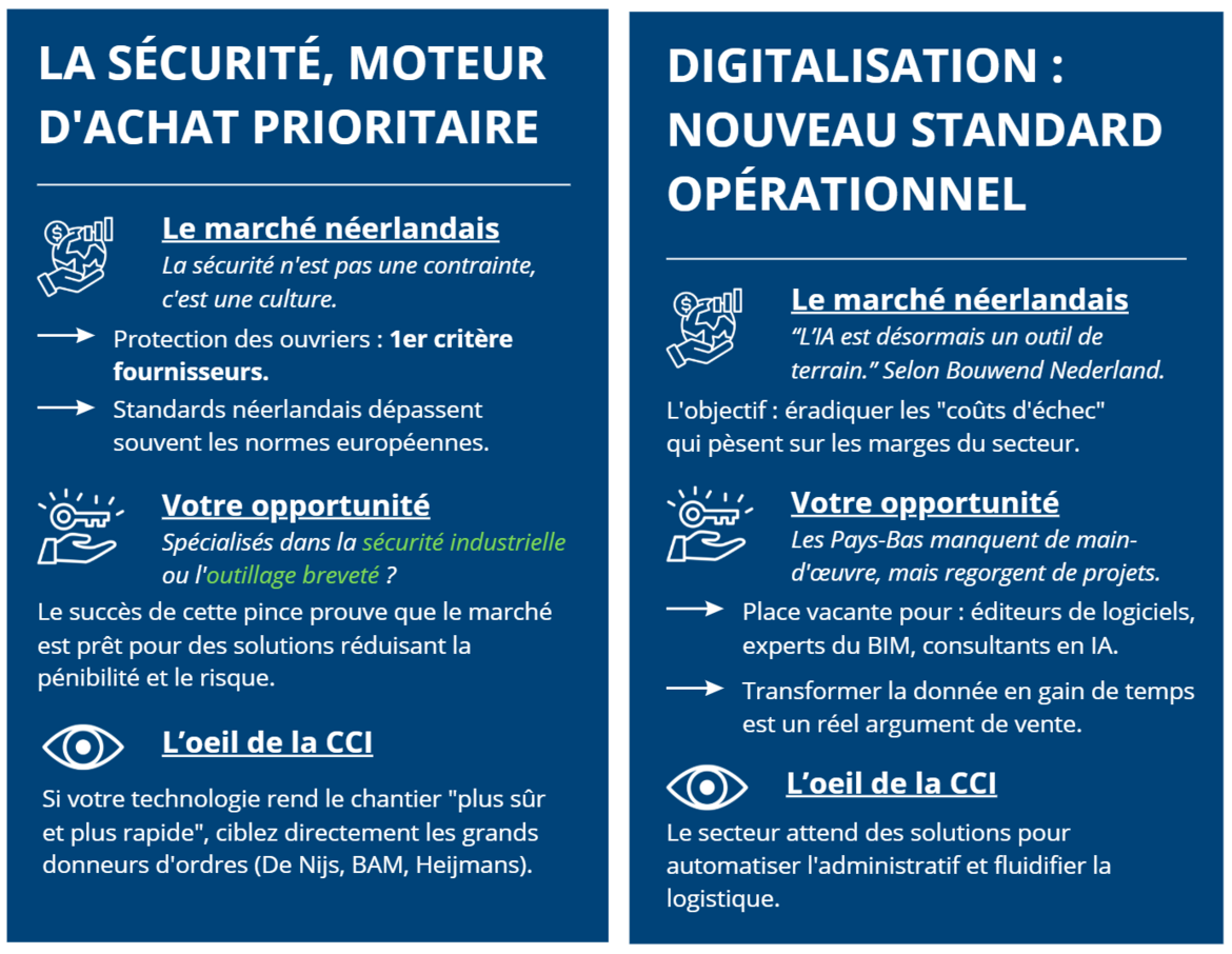Ce qu'il faut retenir ce mois-ci : Le secteur du BTP néerlandais accélère sa transformation technique pour répondre à l'urgence de production. Entre sécurité physique et intelligence numérique, voici les deux signaux forts identifiés par les acteurs locaux.