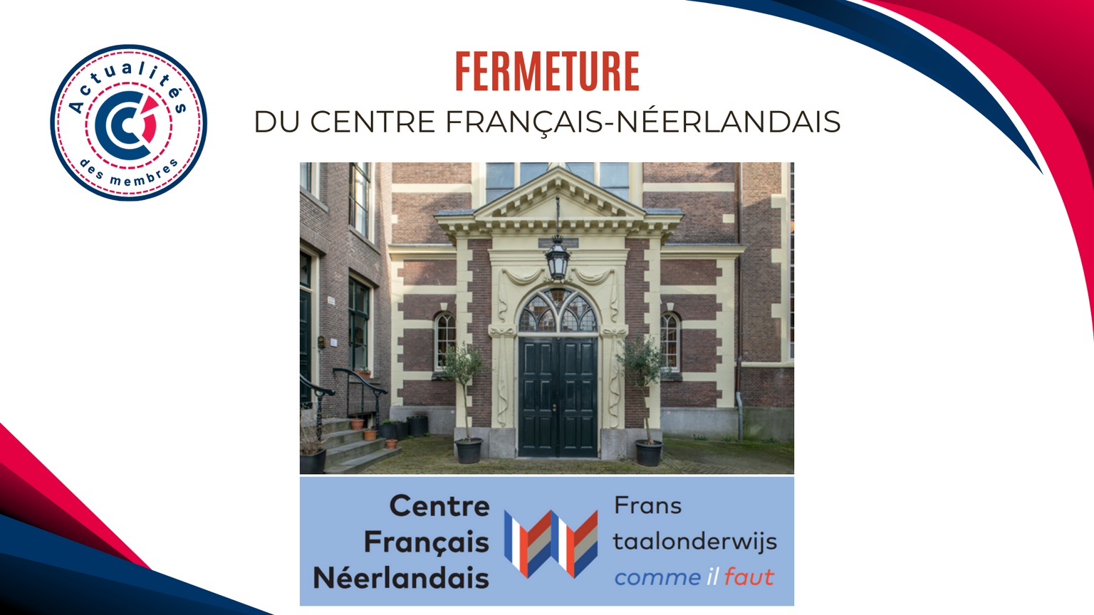 C'est avec une grande tristesse que nous devons vous informer que le Centre Français-Néerlandais devra fermer ses portes à partir d'aujourd'hui.