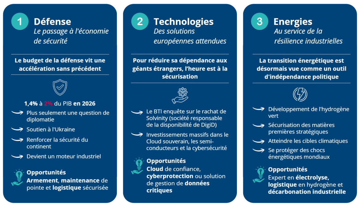 Si les indicateurs macroéconomiques virent à l'orange, ils signalent aussi le déplacement massif des capitaux vers de nouveaux piliers de croissance. Pour les entreprises agiles, ce pivot vers la souveraineté est une chance historique de se repositionner sur des marchés sécurisés et prioritaires.