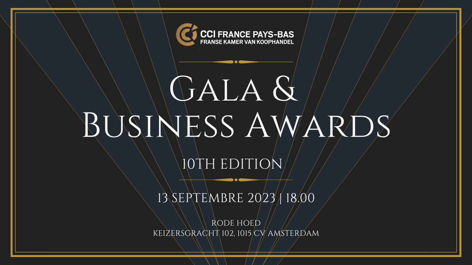 La CCI France Pays-Bas a le plaisir de vous convier au Gala de Rentrée | Trophées du Commerce 2023 dans le renommé "Rode Hoed'' à Amsterdam.