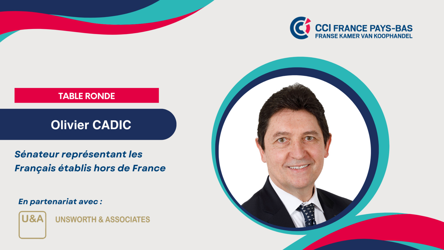 Le 7 novembre prochain, nous aurons le plaisir d'accueillir Olivier CADIC, Sénateur représentant les Français établis hors de France, lors d'une rencontre organisée avec notre partenaire Unsworth & Associates. L'occasion d'échanger sur le climat économique aux Pays-Bas, dans un contexte de paysage politique en mutation, tant en France qu'aux Pays-Bas.