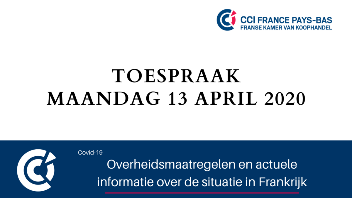 In een nieuwe televisietoespraak vanuit het Élysée kondigde president Emmanuel Macron op maandag 13 april 2020 de verlenging aan van de lockdown "tot maandag 11 mei", de mogelijkheid om alle symptomatische mensen vanaf die datum te testen en "uitzonderlijke hulp aan de meest getroffen gezinnen".