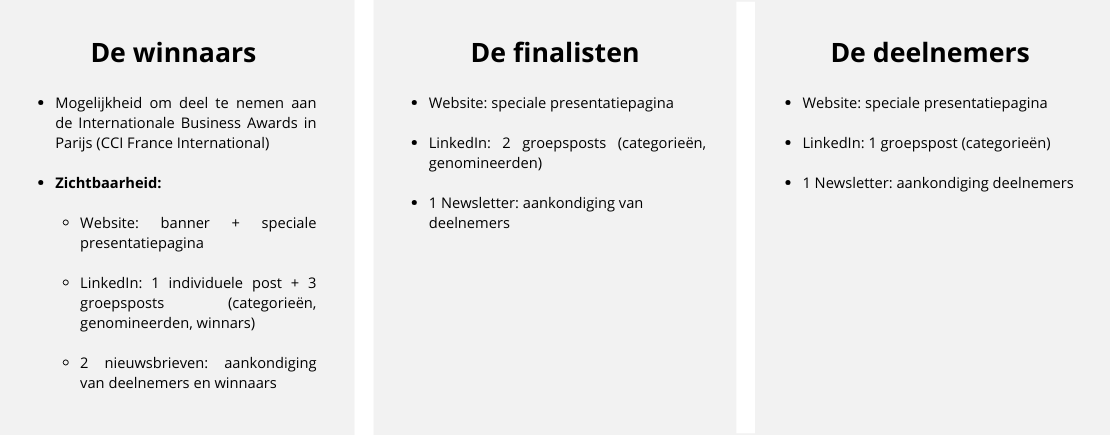 Dit jaar bieden we 6 categorieën aan. We herhalen dit jaar de categorie Beste Frans-Nederlandse samenwerking, die werd gecreërd voor het bilaterale economische jaar 2025 en die een vruchtbare en successvolle samenwerking tussen enerzijds een Frans en anderzijds een Nederlands bedrijf in het zonnetje. We willen deze categorie voortzetten om deze essentiële bilaterale samenwerking in Europa te blijven vieren!
